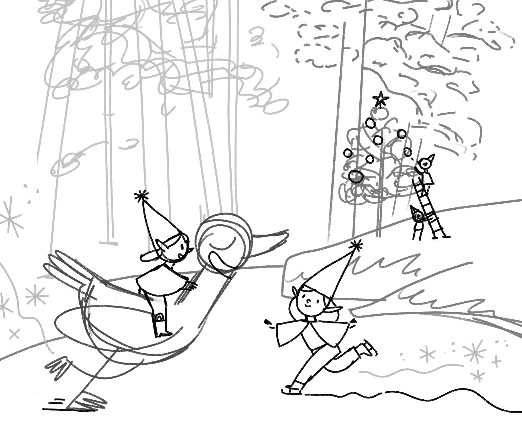 They needed 3 sketches to choose from but I made way more than that. Maybe you’re better at figuring out what direction you want to go but for me, I’ve gotta wander around a bit first. I didn’t love any of these. I almost loved the skating one but I’ve been really into gooses lately and I wanted something a bit more unexpected and magical.